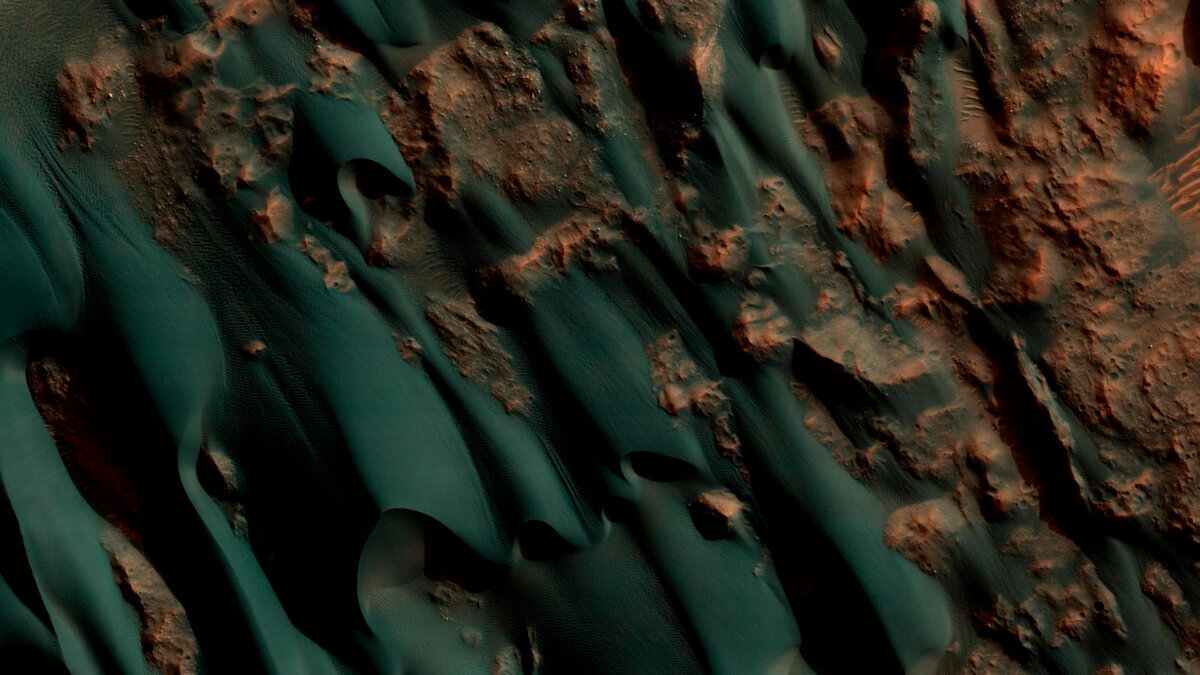 Таинственные дюны, представленные вашему вниманию, позволяют определить доминирующее направление ветра в данном регионе. Кроме этого, рядом с дюнами можно увидеть многочисленные каналы, которые указывают на присутствие жидкой воды в далеком прошлом.
