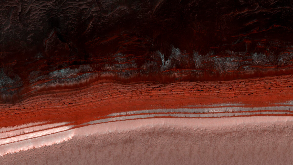 Перед вами необычный уступ, находящийся на Северном полюсе, где сейчас относительно тепло. Дневное повышение температуры приводит к тому, что там начинают сходить лавины! Конечно, по своей мощности они не сравнятся с земными, да и состоят они по большей части из сухого льда, смешанного с небольшим количеством водяного льда.