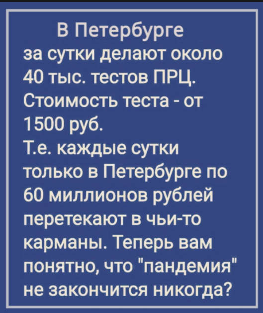 Что и требовалось доказать! Всё делается исключительно из-за денег! "Большинством крупных лабораторий в России, которые проводят тестирование на ковид, владеют иностранные компании, прибыль которых уходит в офшоры."