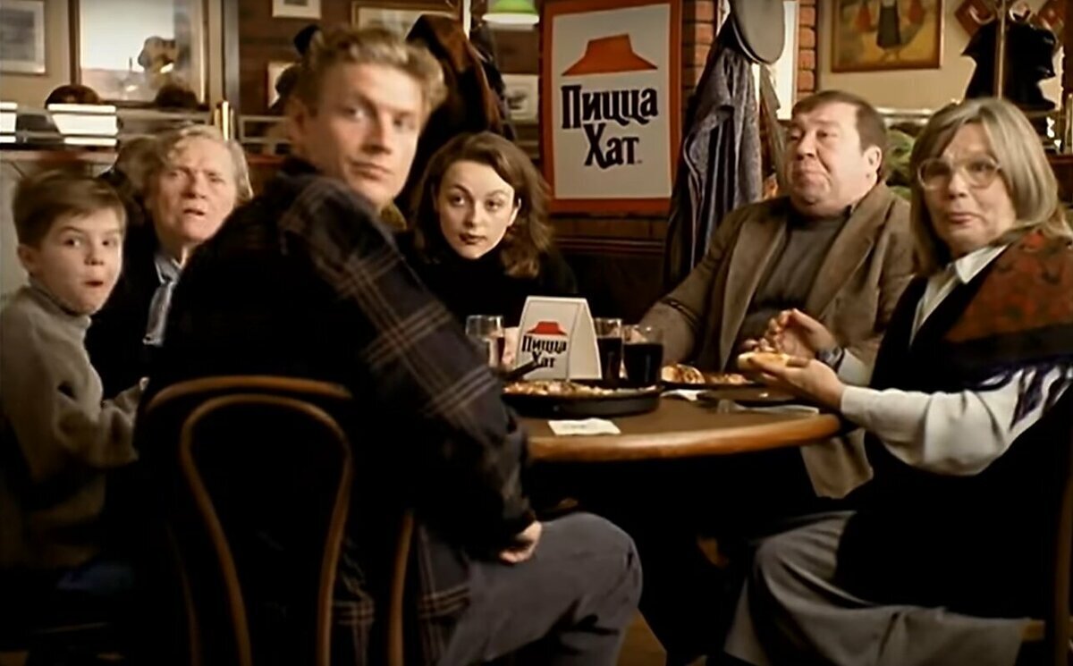 Сеть “Pizza Hut”, принадлежавшая компании PepsiCo, появилась в СССР в 1990 году. Точка, где снимался ролик, располагалась не совсем в сердце столицы. Вывеску просто прицепили над входом в ювелирный магазин ради вида на Собор Василия Блаженного из окна.