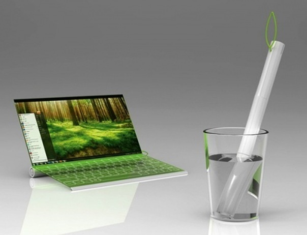 У ноутбука Plantbook гибкий дисплей, сенсорная клавиатура, и… он сворачивается в трубочку! Также для его зарядки можно не просто использовать обыкновенную солнечную энергию, но и воду! Невероятно то, что при этом гаджет вдобавок вырабатывает кислород! Чтобы все понять владельцу ноутбука, была создана специальная петелька в виде листика, которая отображает уровень заряда батареи.