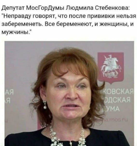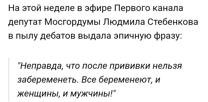 "По словам депутата Мосгордумы Людмилы Стебенковой вакцина не просто защищает от коронавируса(что тоже по моему мнению спорно), но и "залететь" от неё можно. Да и беременеть могут все, то есть не только женщины, но и мужчины.🤗"