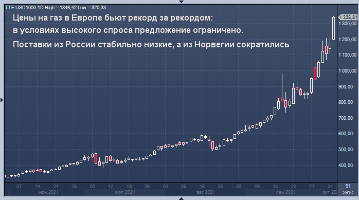 Газовый рынок Европы не стабилен уже не первый месяц. В начале августа контракты на поставку газа торговались по 515 долларов за тысячу кубов, а в октябре его цена подскочила до своего исторического максимума — 1937 долларов. Эксперты связывают такие скачки также с низкой заполненностью хранилищ.