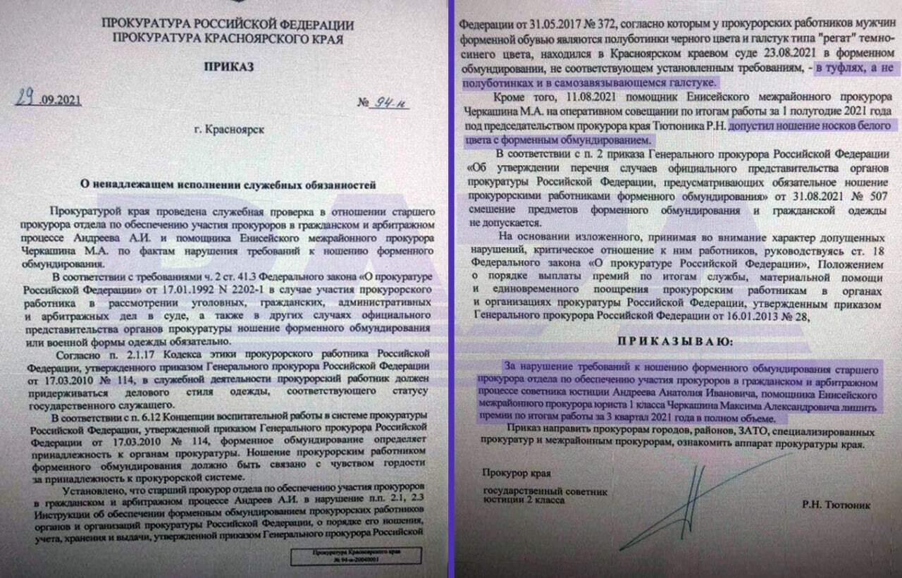 Помощник прокурора Максим Черкашин пришёл на совещание в белых носках, а старший прокурор Анатолий Андреев заявился в суд в туфлях и самозавязывающемся галстуке. По мнению главного прокурора края Романа Тютюника, своими непозволительными выходками Черкашина и Андреев опозорили прокуратуру. Их лишили премии за третий квартал года в полном объёме.