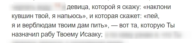 Так ответила страннику красавица Ревекка. Уже поднимаясь в гору, она остановилась, напоила незнакомца и предложила начерпать воды для верблюдов. Слуга не ошибся, впоследствии Исаак был счастлив в браке с Ревеккой.
