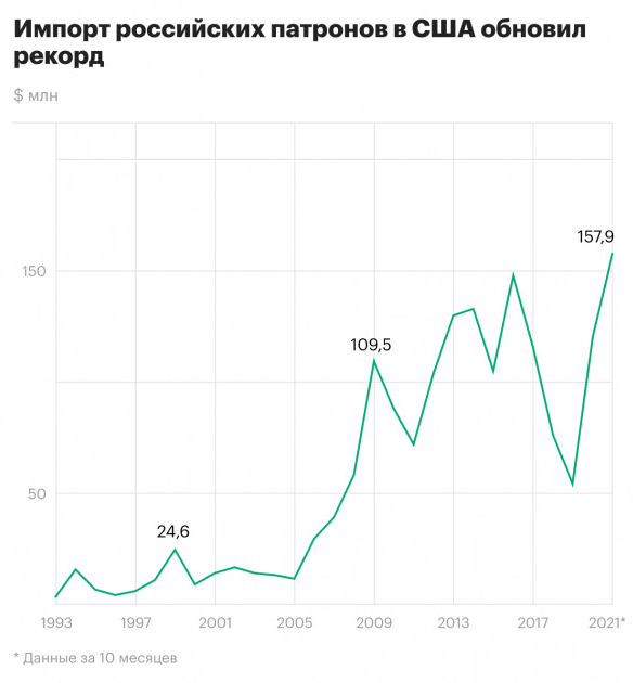 В 2021 году поставки российских патронов и их составных частей в Соединенные Штаты в денежном выражении установили рекорд в новейшей истории России — с начала 1990-х годов. Об этом свидетельствуют внешнеторговые данные Бюро переписей США (аналог Росстата). Чтобы обновить рекорд, хватило десяти месяцев — этому не помешали даже новые санкции Вашингтона, направленные как раз против импорта стрелкового оружия и боеприпасов к нему из России.