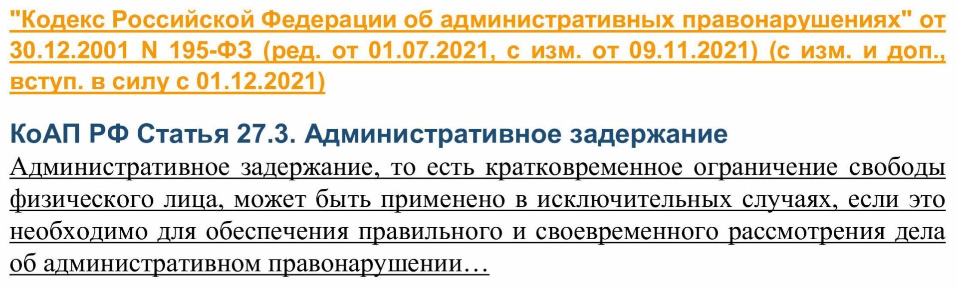 - важно помнить, что срок задержания начинает отсчитываться с момента непосредственного задержания. При этом cрок aдминистрaтивнoго зaдeржания не можeт прeвышать 3 часов (ч. 1 ст. 27.5 КоАП РФ), а в некоторых исключительных случаях (ч. 2, 3 ст. 27.5 КоАП РФ) – 2 суток;