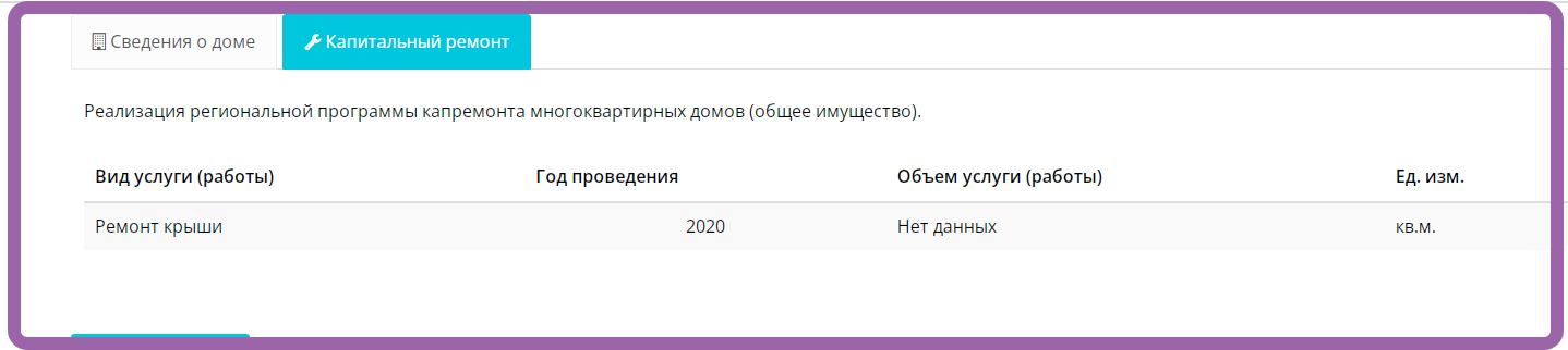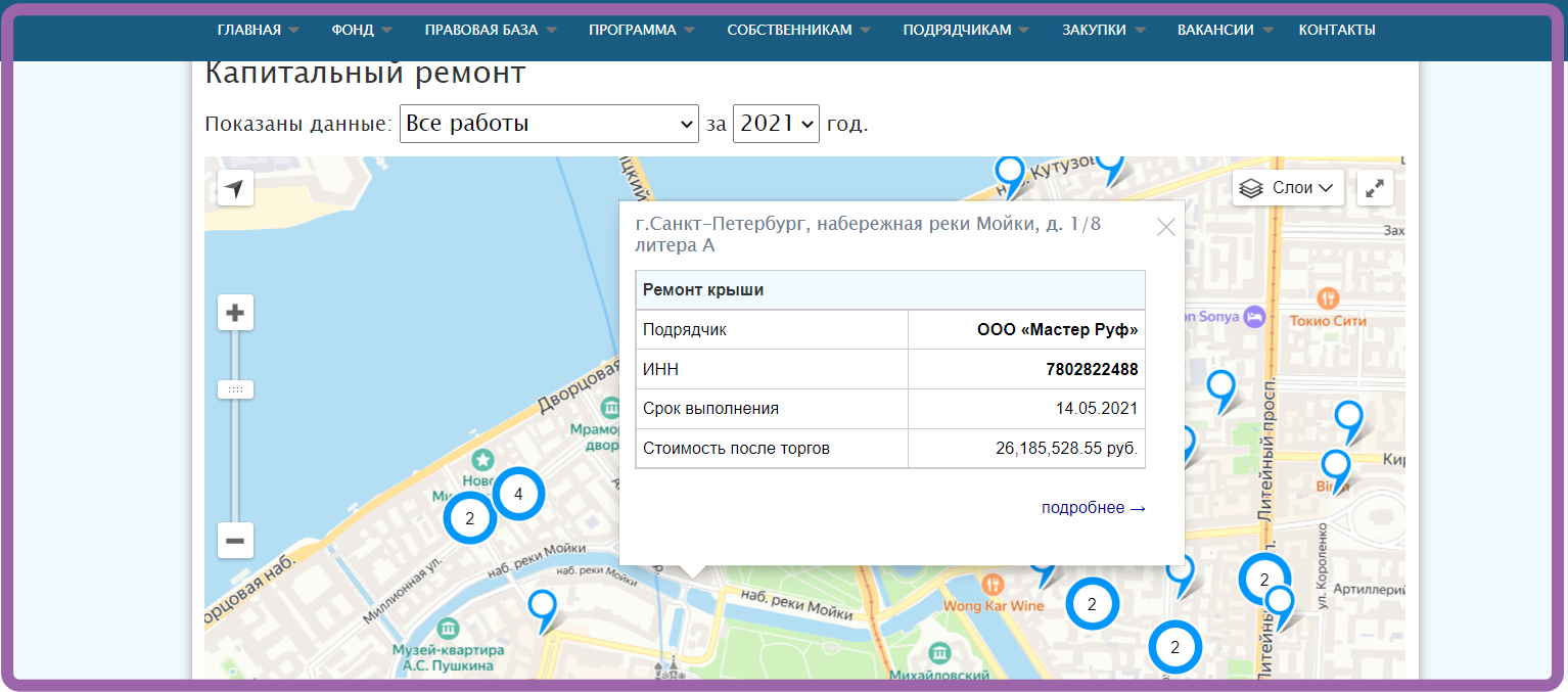 На сайте регионального оператора достаточно легко узнать сроки проведения капитального ремонта МКД, объем и виды работа, а также выяснить кто подрядчик: