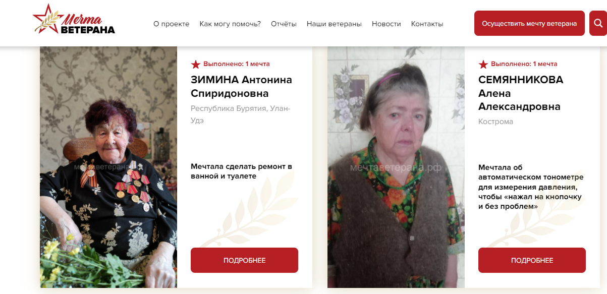 Сайт-проект официально называется «Мечта ветерана», где собираются деньги на такие маленькие, но такие важные для просящих мечты: купить микроволновку, стиральную машину, холодильник, перекрыть крышу, провести канализацию… Такие бытовые и такие простые мечты!