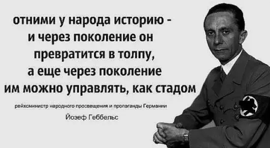 Даже подонки понимали, что любой народ без знания своей истинной истории - это стадо баранов, тупорылое быдло, среди которого и приходиться существовать. 90% тупых дебилов до сих пор считают, что не их предки начали со своим другом -социалистом Гитлером в 1939г. ХОРОШУЮ войну, получив за это разрушенную страну к 1945г. с 50 млн. погибших, минимум. «Депутат Госдумы Николай Земцов представил доклад «Документальная основа Народного проекта «Установление судеб пропавших без вести защитников Отечества», в рамках которого были проведены исследования убыли населения, изменившие представление о масштабах потерь СССР в Великой Отечественной войне.