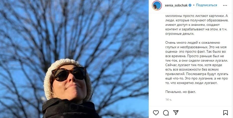 Собчак рассказала, что в старые времена люди вместо просмотра видео в Tik-Tok "сидели семечки лузгали". "Сейчас же они лузгают тик-ток, а послезавтра будут лузгать еще что-то", — добавила Собчак, отметив, что многие люди не пользуются возможностью "получать знания без всяких привилегий".