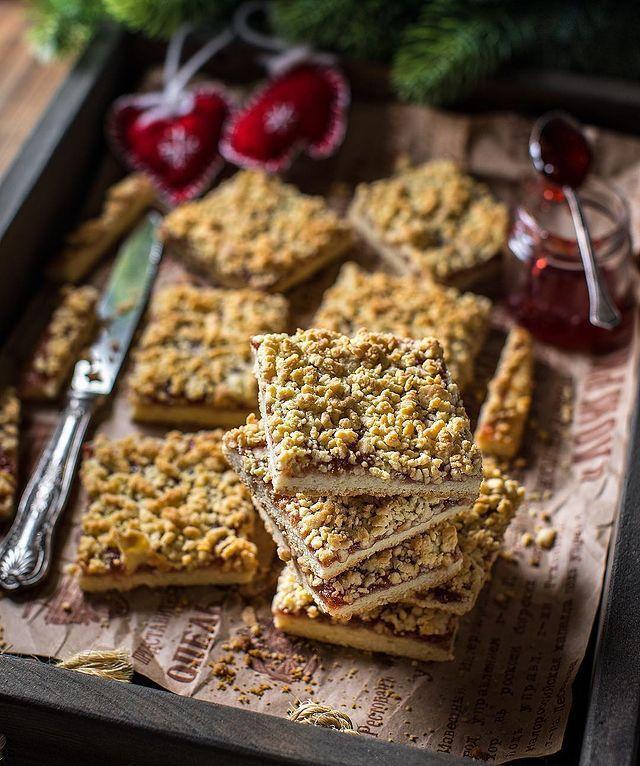 4. В это время вторую часть теста раскатываем в прямоугольник размером 30 на 20 см и толщиной в полсантиметра, выкладываем на противень с пергаментом, смазанный маслом. Поверхность теста смазываем вареньем (не жидким). Достаем тесто для крошки из морозильника, трем на терке, посыпаем слоем на варенье и отправляем в разогретую до 180 С духовку на 20-25 минут до золотистого цвета. Вынимаем, разрезаем на квадраты и печенье готово!