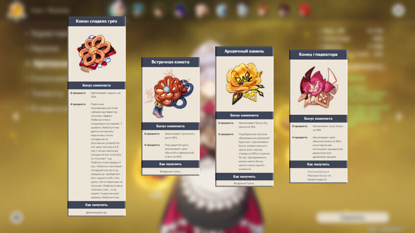 Гибридные вариантов довольно много: 2х Кокон сладких грёз (+30% защиты), 2х Архаичный камень (+15% Гео урона), 2х Гладиатора / Воспоминания Симэнавы (+18% силы атаки). Для начинающих игроков — 2х Воли защитника (+30% защиты) и 2х Учёного / Изгнанника (+20% восстановления энергии), 2х Воин (+15% урона обычной и заряженной атаки), 2х Берсерк (+12% шанса крита).