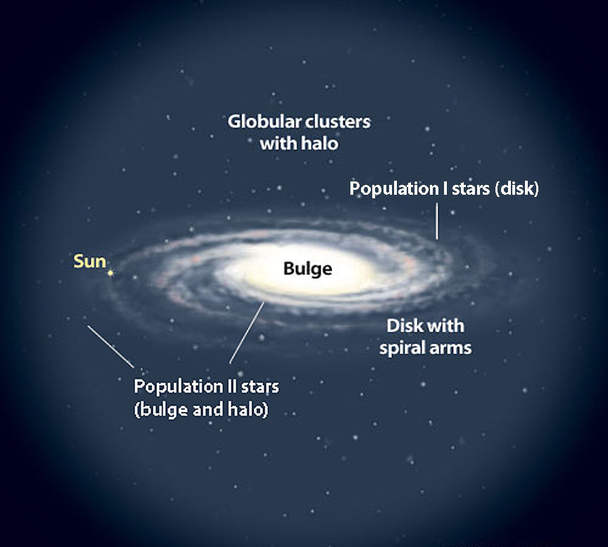 Наша галактика Млечный Путь рассматривается с гипотетической точки зрения постороннего. Разомкнутые звездные скопления и эмиссионные туманности обычно находятся внутри спиральных рукавов, где обитают молодые звезды населения I, в то время как шаровые скопления и более старые звезды населения II покрывают сферическое гало, окружающее диск. На расстоянии 26000 световых лет от нашей Солнечной системы центральная выпуклость скрывается за пылевыми облаками в Стрельце