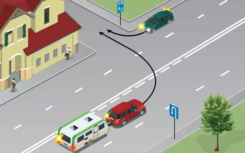 Водитель поворачивает через прерывистую линию разметки. Но перед разрывом установлен дорожный знак 6.3.1 «Место для разворота», который запрещает поворот налево (приложение 1 к ПДД РФ). За нарушение — штраф 1000–1500 рублей по части 2 статьи 12.16 КоАП РФ.