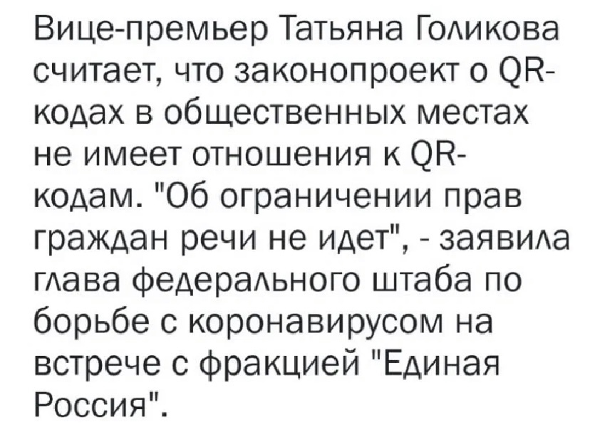 Весь абсурд, который рассказывает Татьяна Голикова, ведёт к одной простой истине, им необходимо выполнить свою задачу, а это одеть на каждого человека QR код любыми средствами.
