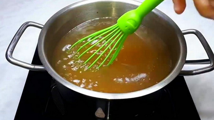 Оставшийся бульон, в котором варилась курица процеживаем через несколько слоев марли, даем остыть. Желатин 20 гр. постепенно всыпать в один стакан теплого бульона, при этом размешивая, чтобы не образовались комочки. Оставить набухать минут на тридцать. Затем вылить желатин в кастрюлю с бульоном, при этом размешивая, можно немного нагреть, чтобы хорошо растворился.