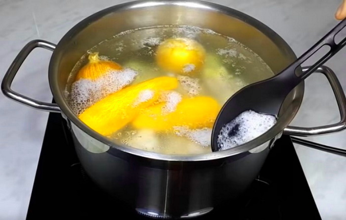 Доводим до кипения, не забывая убирать пенку. Как только вода закипела, убавляем огонь, нельзя чтобы кипение было бурным, бульон получится мутным.