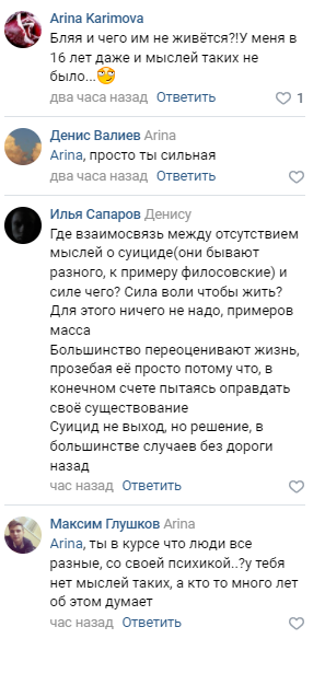 А теперь почитайте комментарии, вчитайтесь в них, разве это нормально, так рассуждать. Чего такого должно происходить в головах этих детей, чтобы быть уверенными, что в жизни есть ситуации, из которых выход - только смерть: