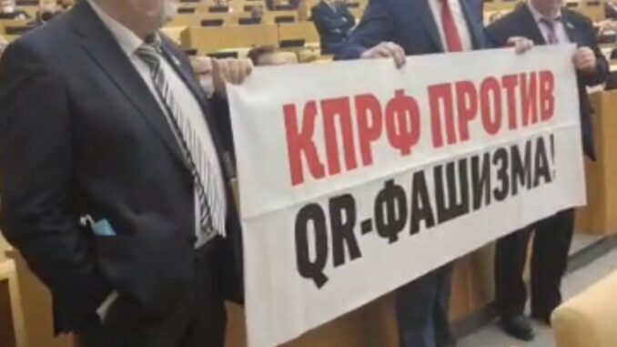 КПРФ спровоцировала скандал в Госдуме во время рассмотрения закона о QR-кодах. Три депутата фракции вывесили плакат, в котором назвали нововведения «фашизмом», а несколько парламентариев «Единой России» попытались вырвать из рук полотнище.