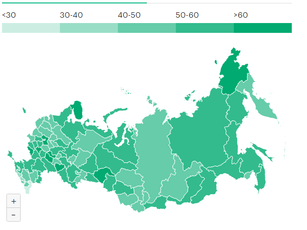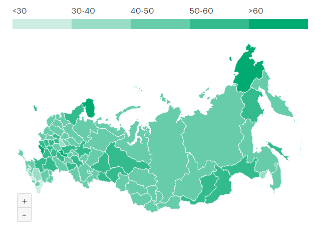 В аутсайдерах по обоим параметрам — Дагестан и Кабардино-Балкария. Количество вторых доз в обеих республиках не превышает 30 на 100 человек населения.