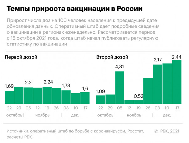 В целом по России темпы вакцинации по сравнению с предыдущей неделей ускорились как по первой дозе (прирост 1,6 дозы на 100 человек против 1,44 неделей ранее), так и по второй (2,44 против 2,26).