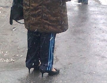 Вот, чего сразу цепляетесь к женщине?!. Конечно, ходить на каблуках и в спортивных штанах по улицам Большого города не слишком красиво. Так ведь она не в ресторан идет, а сейчас на улице - зимние холода.