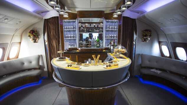 Полностью укомплектованный бар со столешницами из оникса на верхней палубе - довольно обычное явление для A380. В меньшей степени это касается полностью функциональных душевых, установленных в люксах Первого класса на самолетах Эмирейтс и Ethiad A380, или полноразмерной двуспальной кровати, которую Сингапур представил в своих двухместных люксах.