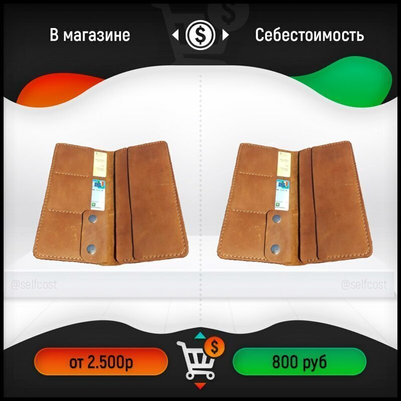На изготовление такого портмоне у опытного работника уходит около 3 часов. При средней оплате в 150 р/час, получается 450 р. Итоговая себестоимость - 800 р. Розничная цена такого портмоне начинается от 2.500 р.