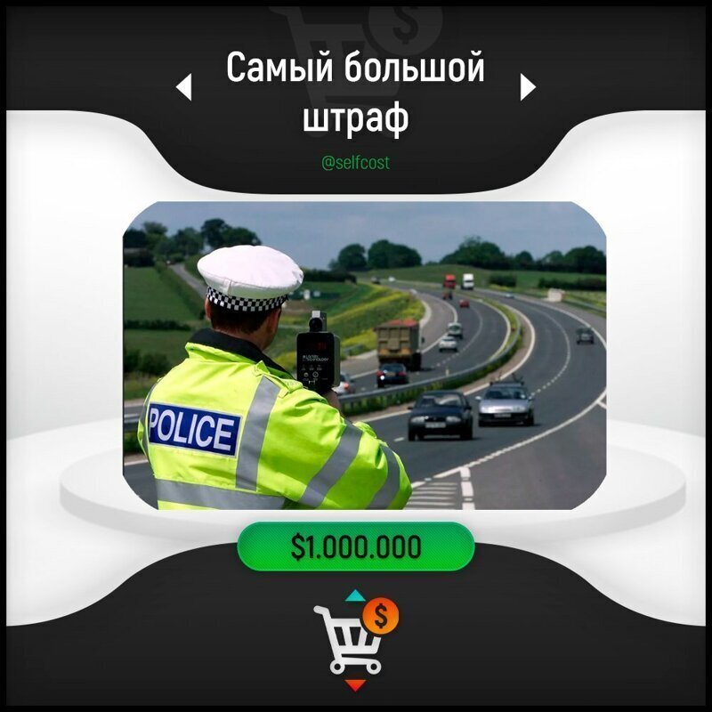 Самый большой штраф был выписан в Швейцарии в августе 2010 года. Сумма штрафа составила ровно $1 млн — дело в том, что по закону этой страны штраф за превышение скорости рассчитывается согласно доходам правонарушителя. Оштрафованным стал 37-летний подданный Швеции, который сумел достичь скорости в 300 км/ч, то есть в 2,5 раза более установленного лимита скорости.