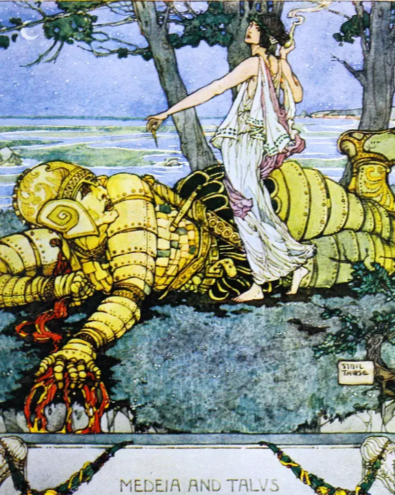 Цветная иллюстрация Талоса из книги Томаса Булфинча о богах и героях греческой мифологии (1920), иллюстрированная Сибил Тоуз