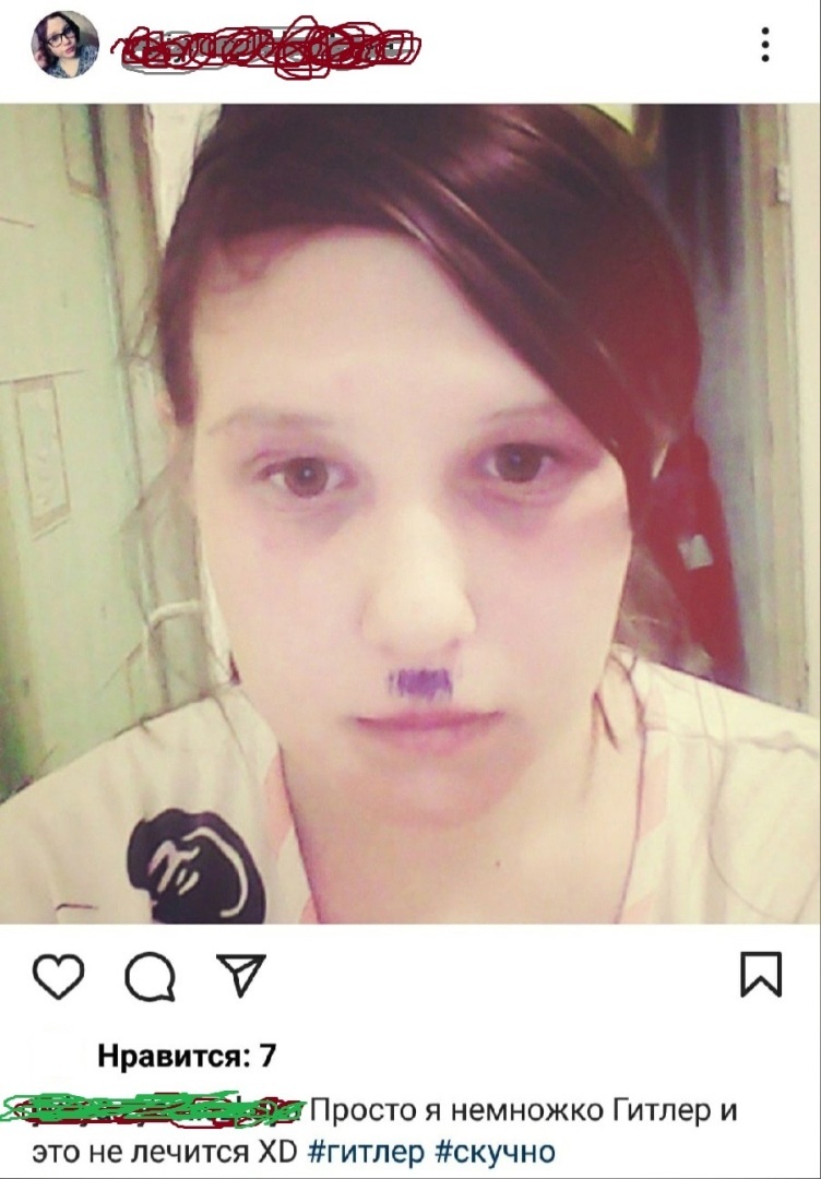 В публикации, не только упоминание фамилии Гитлер, но и зрительная пародия, а это уже пропаганда "Нацизма" как минимум, а что будет как максимум, будет решать следователь управления "Э" в ФСБ.