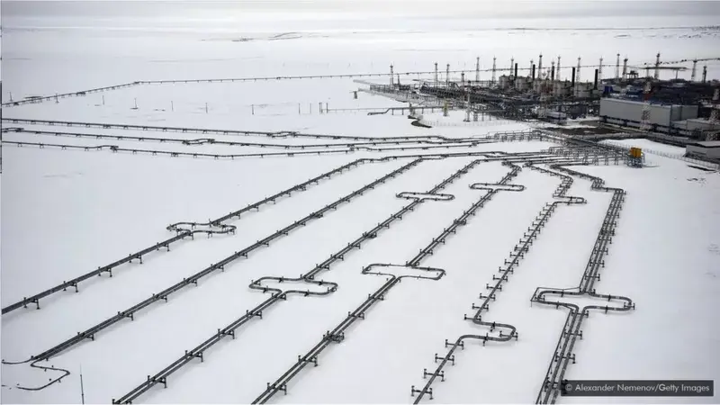 Объекты добычи нефти и газа в ледяной глуши Западной Сибири. Газовое месторождение Поваленково находится всего в 26 милях от кольцевого кратера. (