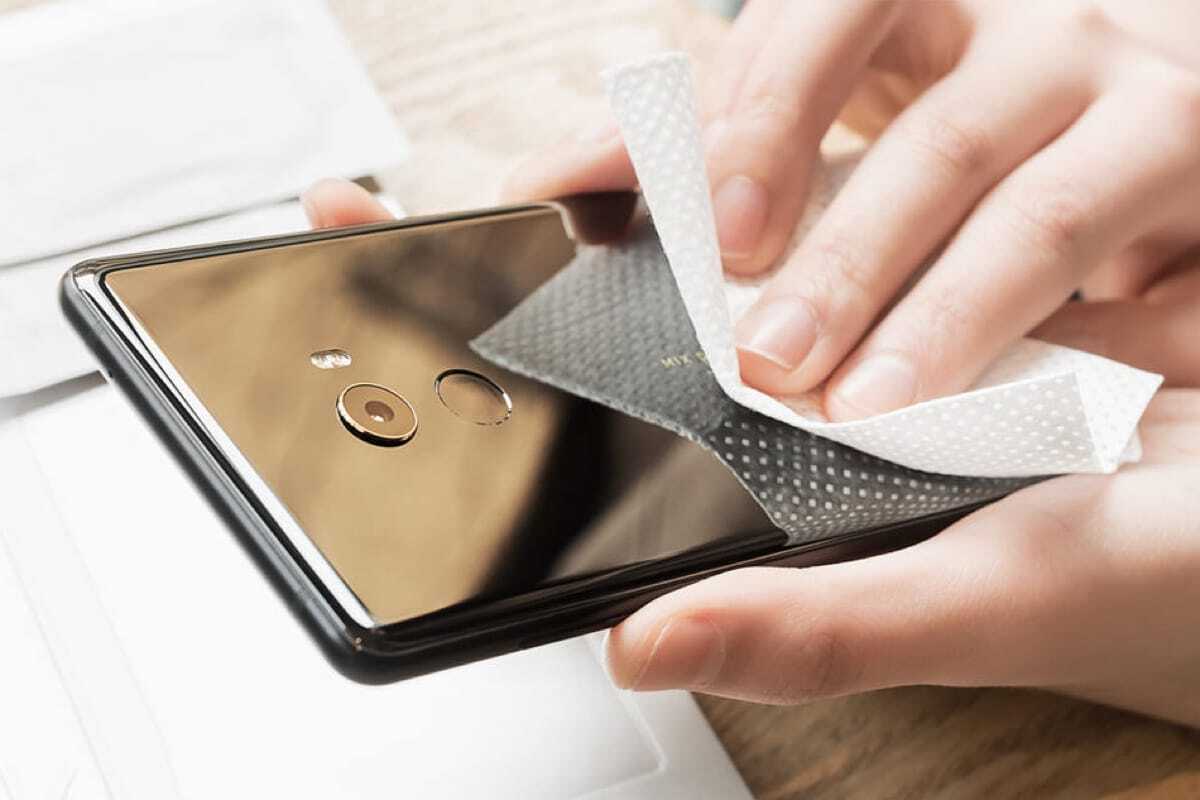 В продаже есть специальные салфетки для чистки панели и экрана смартфона, они пропитаны специальным дезинфицирующим раствором. Они стоят в районе 100 рублей. Однако если таковых нет или в магазин не попасть, то можно воспользоваться и спиртом. В микрофибру наматываем салфетку, выключаем телефон и протираем влажной тряпкой.