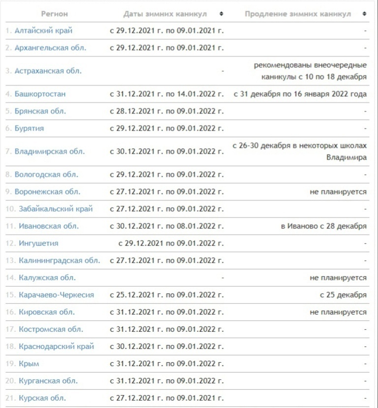 Зимние каникулы должны начаться во всех регионах России 29 декабря и продлиться до 9 января 2022 года, а учеба начнется только с понедельника 10 января 2022 года. Регионы могут изменить даты каникул, в том числе досрочно распустить учеников по домам. Это может быть связано с неблагоприятной эпидемиологической обстановкой в конкретном регионе.