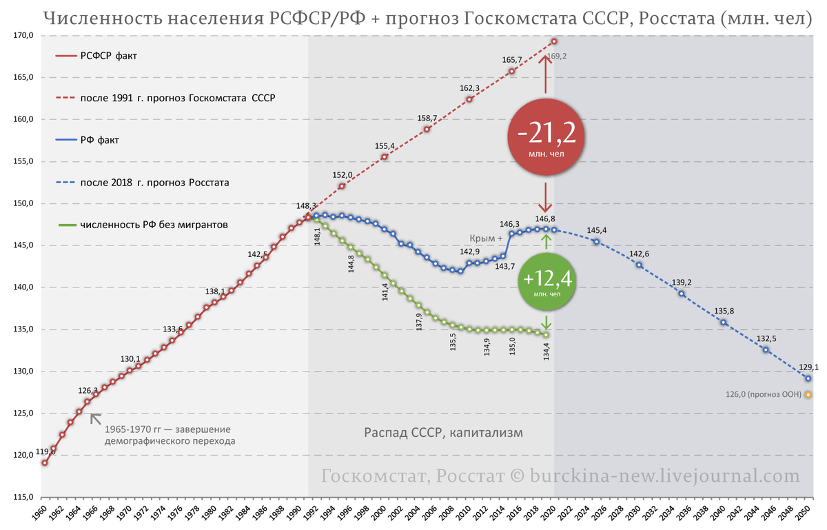 И действительно, если судить по демографическому прогнозу 1990 года Госкомстат СССР, данному до 2015 года, в границах нынешней РФ сейчас бы проживало порядка 170 миллионов человек: