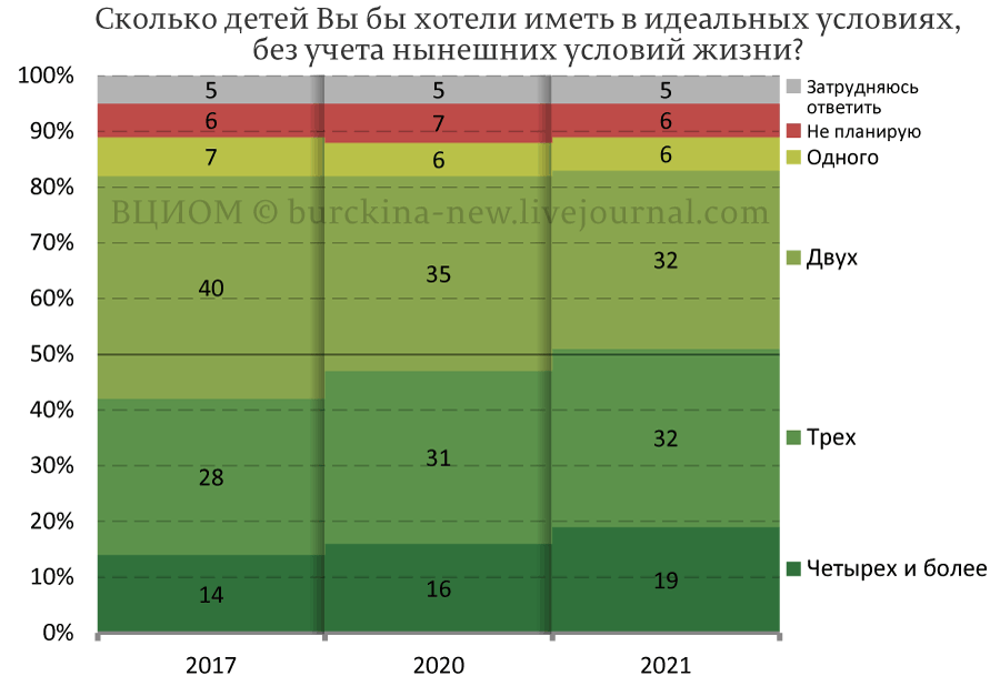 В свете этого интересен вопрос "А сколько бы детей имели россияне в идеальных условиях жизни?", т.е. при наличии достойных доходов, любимой работы, возможности решать жилищный вопрос и перспектив для своих детей?