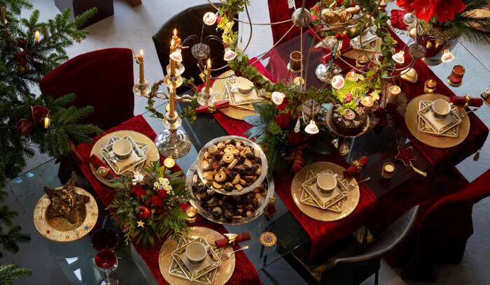 Декорировать праздничный стол лучше натуральными материалами: еловыми ветками, шишками, веточками рябины, желудями. В качестве подставки для тарелок можно использовать деревянные кольца-спилы.