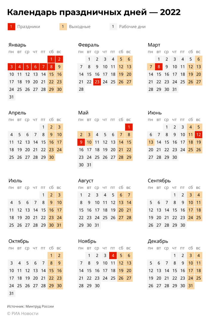 По утвержденному правительством РФ производственному календарю на 2022 год число официальных выходных дней составит 118. Как будут отдыхать жители России на праздники, как долго продлятся новогодние и майские каникулы, сколько будет переносов выходных дней — в материале РИА Новости.