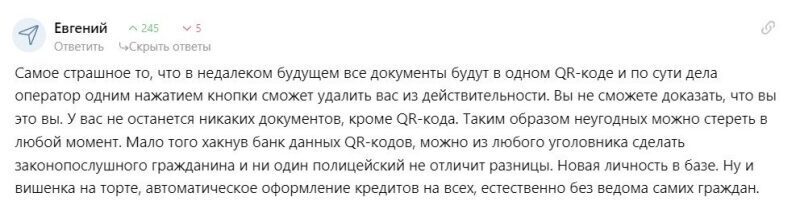 «Законопроект не вводит никаких QR-кодов, он вообще не про них. Речь идет о едином документе, электронном или бумажном сертификате, применяемом на всей территории России. Он содержит данные о вакцинации, перенесенном заболевании, медотводе. Это просто технологическое решение, которое позволяет быстро подтвердить действительность и сроки действия сертификат», — объяснила суть законопроекта вице-премьер РФ Татьяна Голикова во время заседания.