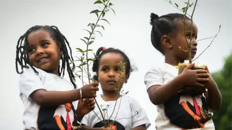 Дети сажают деревья в Эфиопии.