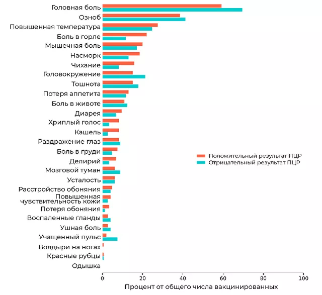 На диаграмме показаны наиболее частые симптомы в первую неделю после вакцинации. Красным показаны те, у кого при тестировании обнаружили коронавирус, синим — у кого тест дал отрицательный результат. В большинстве случаев симптомы в обеих группах очень похожи — невозможно определить, является ли человек COVID-положительным или страдает от побочных эффектов вакцины