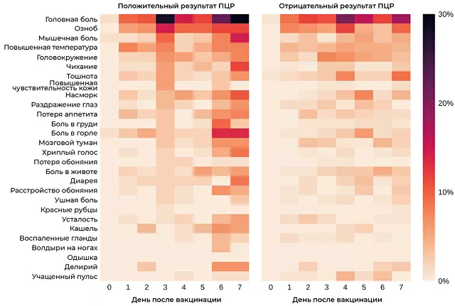 Анализ показал: нет признаков, позволяющих уверенно различить реакцию на вакцину и начало заболевания. Это не удалось сделать ни с помощью машинных моделей, ни с помощью принятых профилей симптомов. У большинства три главных проявления болезни отсутствовали, их зафиксировали лишь у 62 участников с положительным тестом и у 3414 — с отрицательным. При этом многие, у кого подтвердилась инфекция, отмечали только утомляемость, головную и мышечные боли — самые частые побочные эффекты прививки.