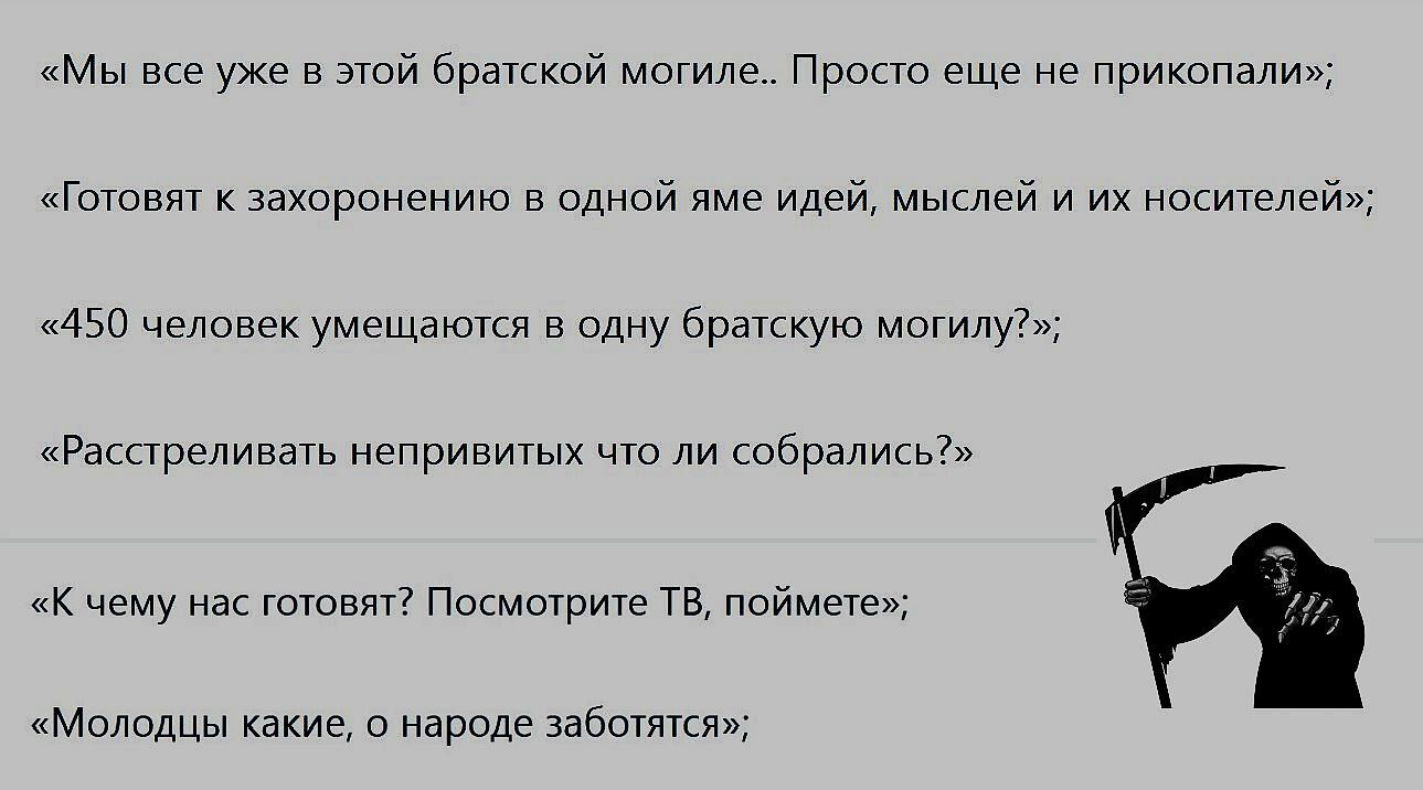 Лично я, весьма озадачен такими паническими и фатальными государственно-ритуальными приготовлениями. В России бешеными темпами идёт оздоровительная вакцинация под руководством гениального и самого главного вирусолога мира - Александра Гинцбурга, стремительно растёт зарплата и униженно рыдает растоптанная инфляция. Да и умирать не хочется, не смотря на уютные и завлекательные братские могилы...