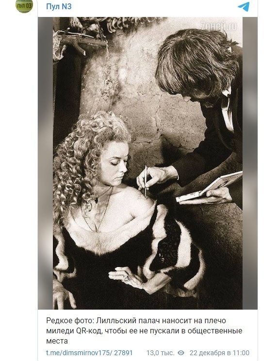 "Редкое фото: Лилльский палач наносит на плечо миледи QR-код, чтобы её не пускали в общественные места", - комментирует фото Дмитрий Смирнов в своём Telegram-канале "Пул № 3".