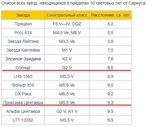 Кстати, вот таблица из той же Википедии, которая показывает звездное окружение системы Сириус в радиусе 10 световых лет: