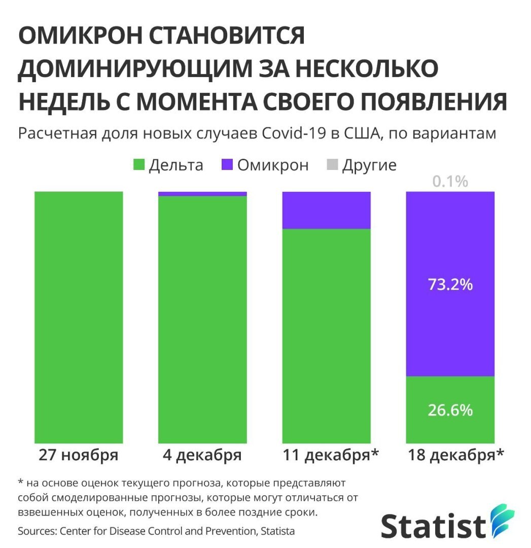 Пока США готовятся к приближающемуся праздничному сезону, Центры по контролю и профилактике заболеваний в понедельник поделились некоторыми тревожными данными. По последним оценкам, Omicron уже доминирует в Соединенных Штатах, на него пришлось 73 процента новых случаев заражения за неделю, закончившуюся 18 декабря.