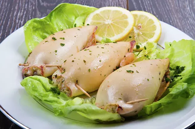 Перед подачей к столу нарезать фаршированного кальмара кольцами и выложить на блюдо.