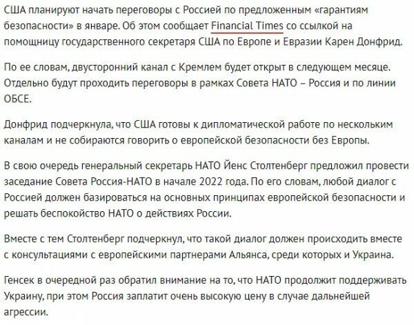 Почти никто не верил, что США и НАТО примут ультиматум России к рассмотрению. Многие диванные иксперды уверяли, что его даже читать не будут. Жизнь показывает, что это не так. Воевать с Россией, это вам не папуасов пугать авианосцами. И в США и НАТО это прекрасно понимают. Особенно хорошо они это поняли после демонстрации новейших российских вооружений. Ракета способная за пару минут уничтожить всю авианосную группировку, это вам не Джавелин какой нибудь, с помощью которого украинские вояки собираются за неделю дойти до Москвы.
