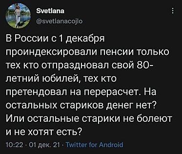 И не более того. Кощунственность самой идеи воровства денег у неимущих стариков, судя по всему, просто не приходит в голову данному индивидууму. Строить офисы, пилить на этом деньги и при этом не индексировать пенсии тем, кто старается заработать себе лишнюю копейку дабы не умереть с голода — это просто верх цинизма. То же самое можно сказать и про тех, кто всё это покрывает.